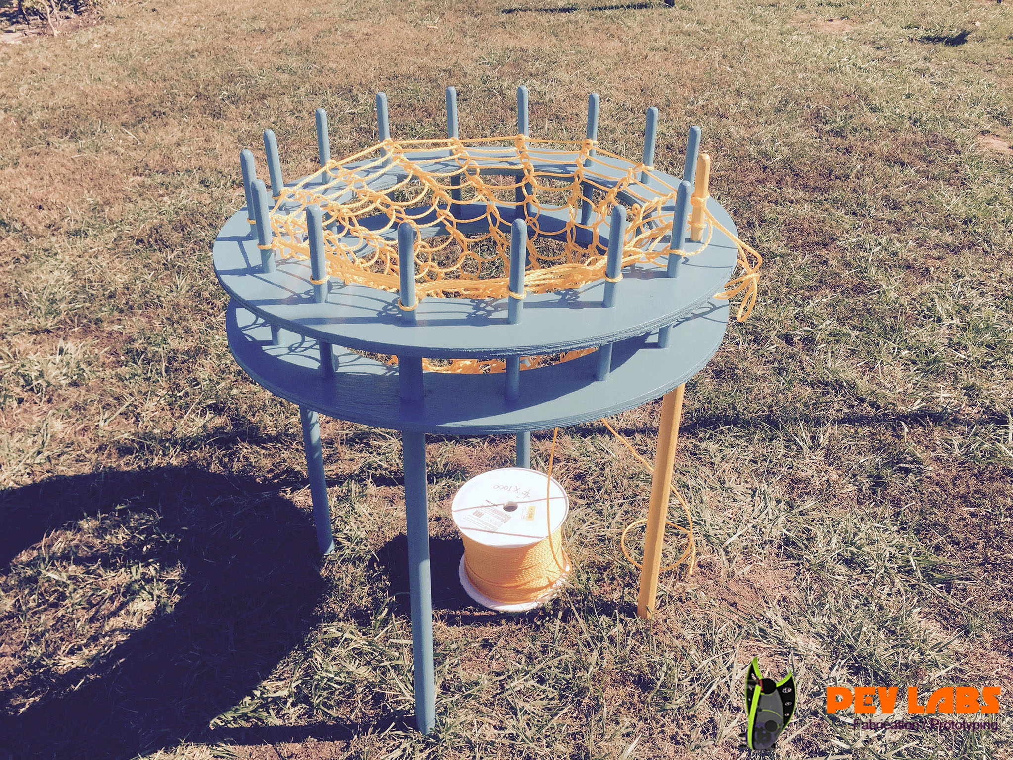 We manufactured this very large DIY Knitting Nancy for a project at the IX Art Park in Charlottesville Virginia. As the park attendees weave more rope tubing large balls are inserted and becomes an unusual park bench. Part of a larger immersive art experience. Our view is art can be more of an on-demand participatory experience rather than just an observation from a viewer. Or to say this device is more for art creators than art consumers. Most Knitting Nancy's are small hand held devices. The one we built is dozens of times larger than the norm. Therefore the knitted results are substantially larger. Unfortunately we did not get any pictures of the resulting woven benches. There are other examples of this online which can be found with a simple web search. This was produced CNC milling the plywood rings with dowel holes. Then driving large dowels, maybe clothing rods with rounded top ends. though the holes.